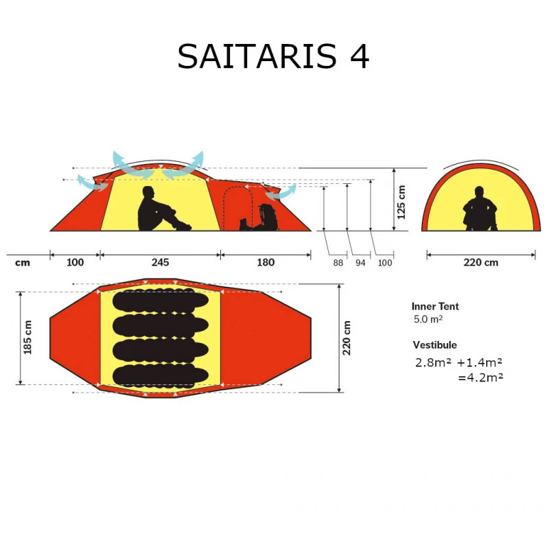 La tente Hilleberg SAITARIS 4 fait partie de la gamme BLACK LABEL la plus rĂ©sistante de la marque suĂ©doise. SĂ©lectionnĂ©e en couleur rouge pour sa visibilitĂ© sur la neige que l’on soit au Spitzberg, en Artique ou en SibĂ©rie. S’adapte Ă©galement parfaitement aux dĂ©serts mixtes sables et cailloux. On adore son volume habitable de 5mÂČ et ses 125cm de haut, ses 2 entrĂ©es indĂ©pendantes, son vestibule pour quitter ses chaussures, ranger ses affaires ou cuisiner Ă l’abri du vent et des mauvaises conditions mĂ©tĂ©os extĂ©rieures… Ses 4 grandes ventilations permettent de parfaitement gĂ©rer les taux d’humiditĂ© chargĂ©s ainsi que la condensation. Convient parfaitement aux expĂ©ditions polaires en toutes saisons mais Ă©galement aux familles de 2 adultes + 2 enfants pour des voyages au long court Ă vĂ©lo…